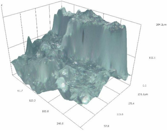 In the denudation stage, when the accelerated corrosion time was 144 h, the surface of the specimen began to show obvious erosion characteristics: Bulge. When the accelerated corrosion was 192 h, the erosion phenomenon was more obvious. From the macroscopic point of view, we saw that there were a lot of scales and flakes on the surface of the specimen. Figure 6 shows the 3D morphology of the specimen surface, which can be seen that the surface of the specimen has a “cliff-type” shape due to the peeling of the material. It indicates that the phenomenon of denudation and stratification occurred. When the corrosion was accelerated for 240 h, the whole exfoliation layer appeared on the surface of the specimen. Since the damage evolution law of pitting stage (corrosion pits) was mainly studied in this paper and it was difficult to accurately obtain the depth of corrosion pits’ data after denudation, the corrosion cycle before 120 h was selected for the following analysis.