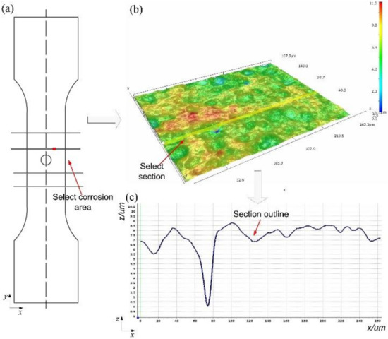 Obtaining the depth of corrosion pits. (a) Section selected for the specimen; (b) Three-dimensional morphology of the corrosion specimen; (c) Schematic diagram of section contour.