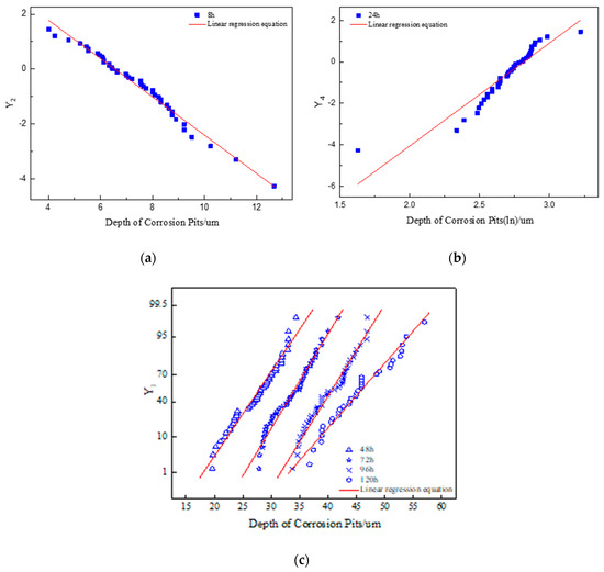 The equations and experimental data in Table 5 are plotted in Figure 9. From the figure, it can also be seen that the linear regression equation combination under different corrosion times fitted in this paper can better reflect the distribution law of the depth of corrosion pits.