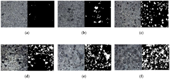 Binarization morphology of the specimen under various corrosion times. (a) Corrosion time t = 8 h, (b) corrosion time t = 24 h, (c) corrosion time t = 48 h, (d) corrosion time t = 72 h, (e) corrosion time t = 96 h, (f) corrosion time t = 120 h.