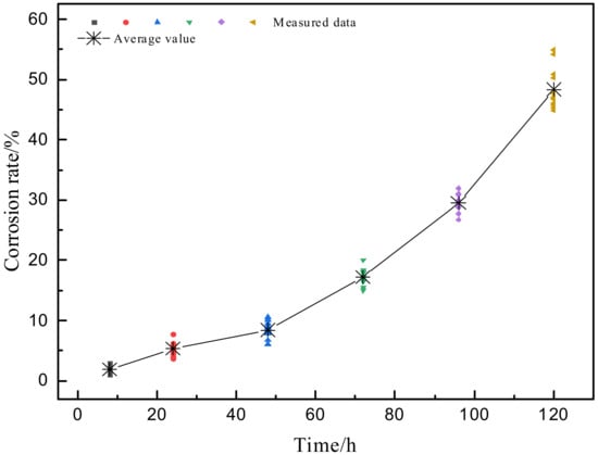 After the image was binarized, the corrosion rate could be easily solved according to the pixel value represented by the pit and the aggregate size of the original image. In this paper, three test pieces were selected under each corrosion time, and a total of four sections were selected for each test piece. The results are shown in Figure 13.