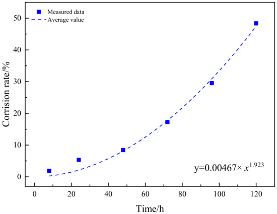 Fitting the relationship between the corrosion rate and corrosion time by the ORIGIN software, the obtained dynamic evolution model was in the form of power function. As shown in Formula (8), the fitting correlation coefficient was 0.989, which had a good correlation.