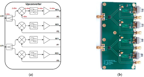 The chosen topology uses the heterodyne configuration. The upconverter is composed, in each channel, by an active mixer, a bandpass filter and an amplifier. To distribute the signal from the local oscillator (LO) to each channel mixer, discrete power splitters were also used.