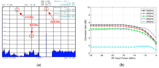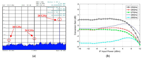 Figure 6b presents the measured conversion gain of the upconverter at different RF frequencies. It should be noted that the RF variation was made through the LO. The measured gain was −1 dB at 28 GHz, slightly below the expected 3 dB. Regarding the 1 dB compression point (P1dB) at the output, 8.6 dBm was obtained, a value relatively close to the expected (10 dBm, as can be seen on the link power budget in Figure 5a).