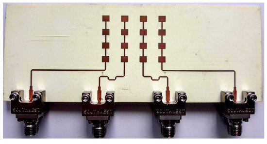 The antenna used at the interface between the free space and the RF frontend modules operates at 28 GHz and is a 4 × 4 series feed planar antenna array described in [26] and shown in Figure 9. The antenna consists of N = 4 individual series feed linear arrays, each using four microstrip patches. The array can provide control of the radiation pattern in the horizontal plane. In [26] is shown the simulated radiation pattern on the horizontal axis. It is possible to observe that the radiation pattern can be steered in different directions by applying a progressive phase shift in the feeding of each subarray. The gain decreases progressively when the direction of radiation moves out of the boresight.