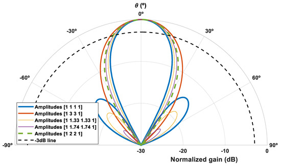Using the theoretical expressions of [27], for the array of N = 4 elements, the feeding distributions were estimated for the binomial method and for the Dolph–Tschebyscheff technique using different values of side lobe level (SLL), such as −15 dB, −20 dB and −25 dB. The SLL represents the signals being radiated in the unwanted direction. Applying such methods in practical application could be very helpful to reduce the interferences.