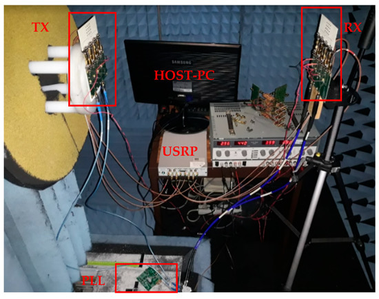 The measurements scenario of the proposed system is illustrated in Figure 12. The setup was placed in an anechoic chamber, and included a power supply, providing the DC voltage to the RF up/downconverter’s boards and the PLL LMX2595 (LO frequency of 12.08 GHz). In addition to the frontend boards and the PLL, the setup also included the Host-PC, the Tx and Rx antenna arrays, and the USRP N310, as can be identified in the Figure 12.
