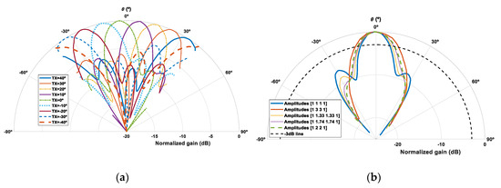 These distributions are provided in Table 2 and were applied to the theoretical Equation (1). In the Matlab, the different radiation patterns, considering all the techniques, were calculated using (1) and multiplying by the theoretical beam pattern of a microstrip patch antenna (element factor), which is the radiating element chosen. The results are shown in Figure 11.