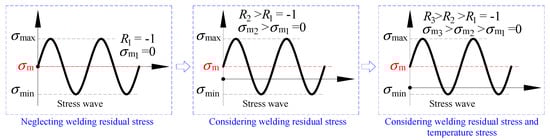 Actually, based on the principle of superimposed stresses, the effect of residual temperature stress could be equivalent to that of stress ratio (R), as illustrated in Figure 1. After taking into consideration the welding residual stress, both R and the mean stress (σm) has increased. Furthermore, both R and σm have further increased due to the effect of residual temperature stress. The increase of R and σm will subsequently affect the fatigue performance of fatigable welds, as evidenced by extensive experimental and numerical studies, which show that the fatigue strength of welds decreases when the stress ratio (or mean stress) increases [3,4,5]. On this basis, the fatigue damage might be underestimated when neglecting the effect of high-temperature pavement paving. Therefore, it is necessary to clarify and quantify such effect on fatigable welds in OSD.