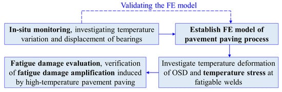 Overall, the objectives of this study consist of (1) investigating the thermal characteristics of bearings-supported OSD during high-temperature pavement paving; (2) investigating the variation of residual temperature stress during the paving process; (3) evaluating the effect of residual temperature stress on fatigue performance of OSD during its service life. To accomplish the objectives, both in-situ monitoring and FE analysis were carried out. Firstly, the thermal characteristics of OSD were analyzed based on in-situ monitoring results. After that, the transient thermal analysis-based finite element model was established and verified based on the monitored data. Subsequently, the deformation of OSD and the variation of residual temperature stress were analyzed. Finally, the effect of residual temperature stress on fatigue performance of OSD was evaluated based on a proposed evaluating framework. The research flow chart is shown in Figure 2. The results address the significance of residual temperature stress in fatigue damage evaluation, especially when a precise evaluation result is needed.