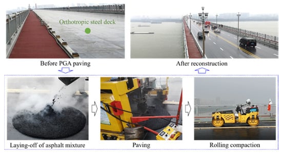 The reconstruction project began in October 2016 and was completed in December 2018. The railway kept in service during the whole reconstruction process. The OSD was placed above the main beams using a set of tension-compression bearings. After that, pouring Gaussian asphalt (PGA) concrete, a widely used pavement material for OSD, was adopted in the pavement paving process (see Figure 3). Generally, PGA has the highest temperature (reaching 220–260 °C) among all paving materials. As introduced in Section 1, it might affect the fatigue performance of OSD, which is mainly focused on in this study.
