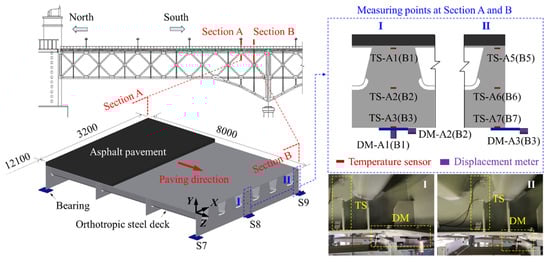 One of the segments of the OSD was selected as the monitoring objective (Figure 4). The length of the segment is 8000 mm. Considering that the paving sequences would lead to temperature differences in the longitudinal direction, the temperature sensors and displacement meters were arranged at both Sections A and B, as shown in Figure 4. Additionally, four temperature sensors were also placed below the pavement centerline (TS-A4 and TS-B4) and pavement edge (TS-A8 and TS-B8) to monitor the ambient temperature. Similarly, TS-B1 to TS-B8 were arranged at the corresponding positions in Section B.