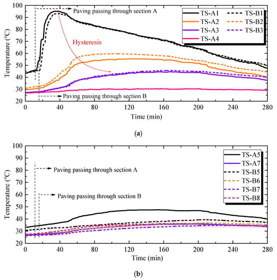 The temperature histories monitored by TS-A1 (B1) to TS-A4 (B4), which are arranged below the pavement center, are shown in Figure 5a. The temperatures at different positions of the diaphragm are affected by the vertical thermal transfer; the vertical temperature distribution of the diaphragm exhibits hysteresis during the PGA paving process. With respect to the temperatures close to the deck plate (monitored by TS-A1 and TS-B1), there is a time lag before the increase induced by the paving sequence; however, the time intervals for other measuring points are negligible due to the hysteresis induced by heat transfer. The temperatures rise quickly after PGA paving, and then decrease at a slower rate.
