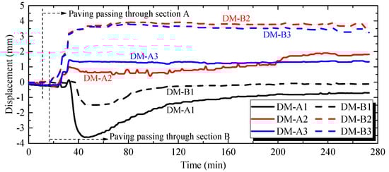 As mentioned above, the bearings might be affected by high-temperature pavement paving. In in-situ monitoring, six displacement meters (DM-A1 (B1) to DM-A3 (B3)) were adopted to monitor the displacement of the bearings. The monitored data are plotted in Figure 6. Due to the thermal transfer, there is a distinct hysteresis in the displacement of the bearings (Figure 6). The displacements monitored by DM-A1 and DM-B1 are negative values, indicating local uplift deformation of the OSD. The vertical displacement increases rapidly at first until reaching its greatest value, then decreases gradually. The maximum values of the vertical displacement at Sections A and B are about 3.6 and 1.5 mm, respectively. The vertical displacement remains stable at 240 min after paving, and the residual displacements at Sections A and B are about 0.7 and 0.1 mm, respectively.