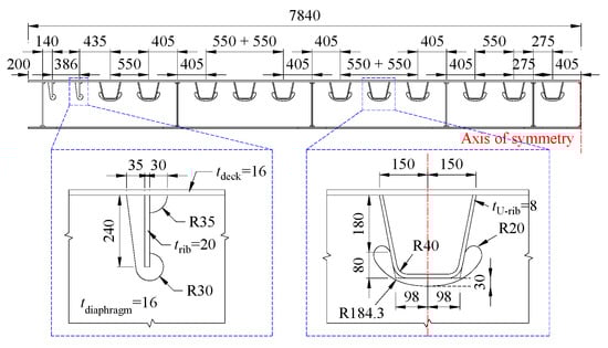 For this purpose, in-situ monitoring is one of the most effective methods [6]; however, it is impractical to install enough sensors or strain gauges. Furthermore, the monitored data are usually insufficient to predict the distribution and variation of temperature and thermal stress. Instead, the finite element (FE) method is commonly adopted to investigate the thermal characteristics of OSD [7,8]. To make the FE model more accurate and reliable, monitored data are usually used to verify the feasibility of the model. Hence, a numerical analysis combined with in-situ monitoring is often adopted for thermal analysis [2,9]. Recently, most studies have been focused on the thermal field induced by ambient temperature, solar radiation, wind, humidity, and their combined effects [10,11,12], while a few studies have assessed the effects of high-temperature pavement paving on the fatigue performance of OSD. The effect of high-temperature pavement paving on the thermal field characteristics and thermal deformation of OSDs of Tongling Yangtze River Bridge and Taizhou Yangtze River Bridge were investigated, of which the OSDs are supported by cables [2,9]. The analytical methods are referable; however, the effect of high-temperature pavement paving on the fatigue performance of OSD is not mentioned. Hence, further studies are needed, especially for the OSDs supported by bearings.