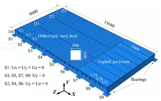 The residual temperature stress was analyzed based on numerical results. For this purpose, it is necessary to simulate the high-temperature pavement paving process first. In this study, the FE model for the coupled thermal-structural analysis was developed using ABAQUS. The dimensions of the model are given in Figure 7, and the FE model is shown in Figure 8. The model was composed of pavement, deck plate, base plate, 21 U-ribs (U1 to U21), four diaphragms (D1 to D4), and 18 bearings with nine at each section (S1 to S9). It should be noted that only the sublayer pavement (PGA) with a thickness of 40 mm was simulated here, neglecting the wearing course. The dimensions of the bearing were 600 (length) × 600 (width) × 20 (thickness) mm. To increase the computational accuracy, the asphalt surfacing, deck plate, U-ribs, base plate, and bearings were simulated by thermal-type solid elements (DC3D8), while the other parts were simulated by thermal-type shell elements (DS4). The global meshing size was 0.2 m, while the meshing sizes of asphalt surfacing, deck plate, bearing, and adjacent regions were refined to be 20 mm. In this case, the number of total elements and nodes are 161,195 and 229,375, respectively. The elastic modulus and Poisson’s ratio of steel were set to 206 GPa and 0.3, respectively. In the process of asphalt pavement paving, the paver can be considered as a moving heat source, thus the space–time change law of local thermal field is presented in the steel bridge deck. Hence, the thermal field of the steel bridge deck during PGA paving is treated as the transient temperature field. Hence, the element deletion approach was adopted to simulate the dynamic process of PGA paving. The simulation procedure is summarized below.