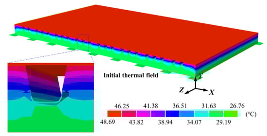 The initial thermal field of the OSDs was simulated before the simulation of high-temperature paving. The combined effects of ambient temperature, wind speed, and solar radiation were considered. The simulated initial thermal field is shown in Figure 9. It could be seen that the deck plate is at the highest temperature (48.69 °C). The temperature gradually decreases from the deck plate to the bearings. In in-situ monitoring, the monitored temperatures before PGA paving could be regarded as the initial temperature of the OSD. Hence, the corresponding monitored data were adopted to verify the FEM. The temperatures before PGA paving are listed in Table 2, where the temperatures monitored by TS-A1 to TS-A3 were adopted for comparison. The differences between the monitored and numerical temperatures are within 8%: this demonstrates that the simulated initial thermal field of OSDs is reliable.