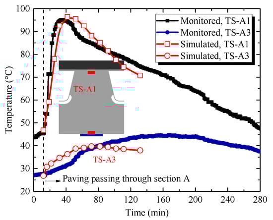 In this study, the monitored data of temperatures and displacement of bearings were both used to validate the FE model. The temperature data monitored by TS-A1 and TS-A3s were adopted to verify the model simulating this dynamic paving process (Figure 10). When the PGA paving passes through Section A, both monitored and numerical temperatures increase rapidly. The maximum values among the numerical results are very close to the monitored results. Generally, the variation in the temperature history curves is also similar. Since the objectives of this study were mainly related to the peak temperatures (e.g., the deformation of the OSDs), the minor differences (e.g., the time taken to reach the highest temperature) were believed to have less effect. Meanwhile, taking into consideration the simplification of the FE model and the measurement errors, it is deemed acceptable to conclude that the developed FE model is valid.
