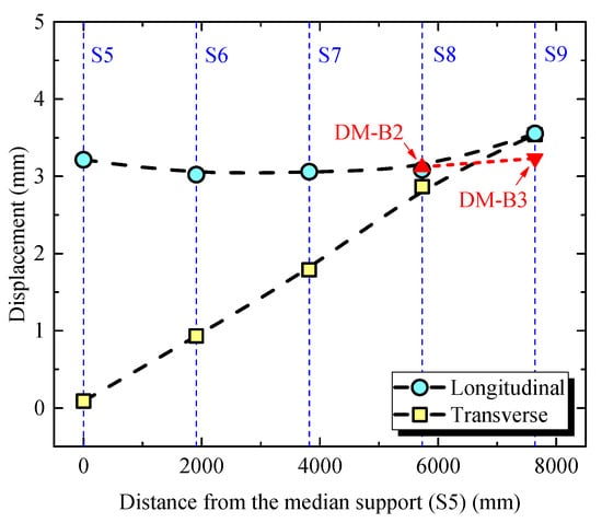 Figure 11 plots the numerical results of the displacements of bearings S5 to S9 at Section B, involving monitored data from DM-B2 and DM-B3. The transverse displacement gradually increases from S5 to S9. The calculated transverse displacement of S8 is 2.86 mm, 8.2% smaller than the monitored value. Meanwhile, the calculated transverse displacement of S9 is 3.54 mm, which is 9.6% greater than the monitored value. With regard to S8 and S9, the increase amplitude of numerical results is larger than that seen in monitored data. The reason for this is that the friction force within the bearings, which affects the displacements of the bearings, is neglected in the numerical simulation. However, since the difference value of monitored and numerical results is within 10%, it is also believed that the developed FE model is reliable.