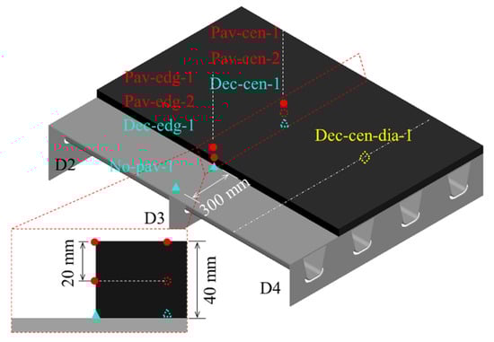 To name the specific points clearly, “Pav” and “Dec” are used to represent the points on the pavement and deck plate, respectively. “edg” and “cen” represent the edge and center of the pavement, respectively. “dia” represents the points located above the diaphragm, and “No-pav” represents points away from the paving area. Apart from Dec-cen-dia-1, which is located above D3, all points are located at the middle between D2 and D3.