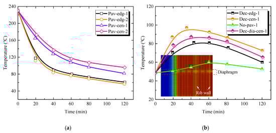 Figure 13b plots the temperature variation at the deck plate. Generally, the temperature first increases, then decreases over time after reaching its highest value. The temperature at the pavement center (Dec-cen-1) increases faster than those elsewhere, and the highest temperature is about 96.9 °C at 35 min after PGA paving. Due to the transverse heat transfer, the temperature at the pavement edge (Dec-edg-1) reaches the highest value of 80.9 °C at 50 min after paving, which shows distinct hysteresis. Additionally, the temperature outside the paving area (No-pav-1) increases more slowly int the initial stage, and the highest temperature is 59.2 °C at 65 min after paving. Furthermore, it could be observed from the temperature nephogram (Figure 13b) that the temperature above the diaphragm and rib walls is lower. This could be attributed to the greater coefficients of thermal conductivity of the diaphragm and rib walls.