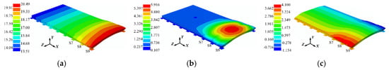 Deformation nephogram of the OSD (amplification factor: 400). (a) Ux; (b) Uy; (c) Uz.