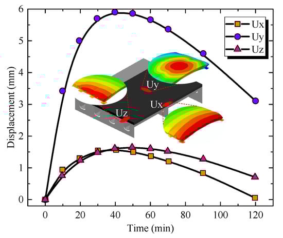 The thermal deformation of the OSD will occur sensibly due to the high-temperature pavement paving. The critical thermal deformation nephogram of the OSD at 40 min after paving is shown in Figure 14. The displacement–time curves at the critical positions are plotted in Figure 15. It should be noted that the values inserted in the nephogram (Figure 14) are equal to the sum of the displacements of OSD and bearings. The displacement of the OSD is the difference between the sum and that of the bearings.