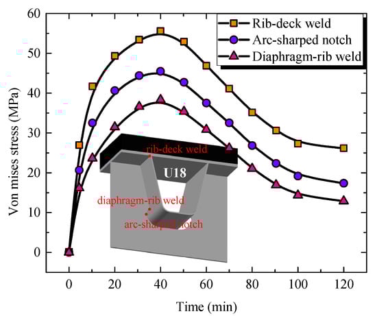 As mentioned above, there is some residual displacement of the OSD and bearings, which might result in residual stresses at fatigable details of OSD. Figure 16 shows the stress–time histories at rib-deck weld, diaphragm-rib weld, and arc-sharped notch after PGA paving. It is seen that the variation in stress is similar to that of the displacements of the OSD (Figure 15). The stress increases at first until reaching a maximum value, then decreases gradually. The temperature stress at rib-deck weld is greater than the one at other details, and the maximum value is about 55.6 MPa at 40 min after paving. The maximum stresses at arc-sharped notch and diaphragm-rib weld are 45.6 and 38.4 MPa, respectively. At 120 min after paving, the temperature stresses at rib-deck weld, arc-sharped notch, and diaphragm-rib weld decrease to 26.1, 17.3, and 12.9 MPa, respectively. This indicates that a certain value of residual stress is generated after PGA paving. Even though the residual stress is much lower than the yield strength of the base metal (e.g., 345 MPa for Q345-typed steel), it affects the mean stress at fatigable details [14], which in turn affects the fatigue performance of welds. Therefore, the effect of the residual temperature stress on the fatigue performance of fatigable details warrants further investigation.