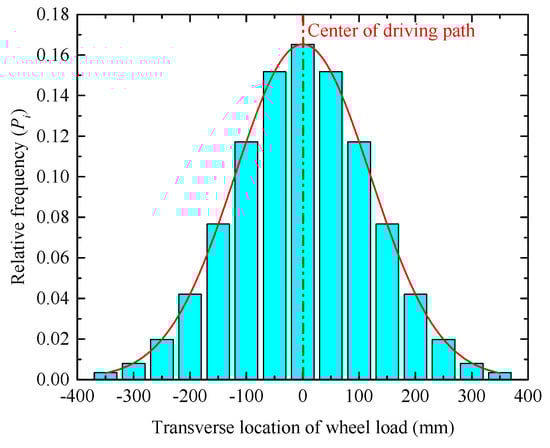 where ΔσR is the fatigue strength based on recommended S-N curves; the constant m is set to 3.0; Pi is the relative frequency of transverse location of wheel load (Figure 17); N is the loading cycles of single wheel per day, valued 1000 here.
