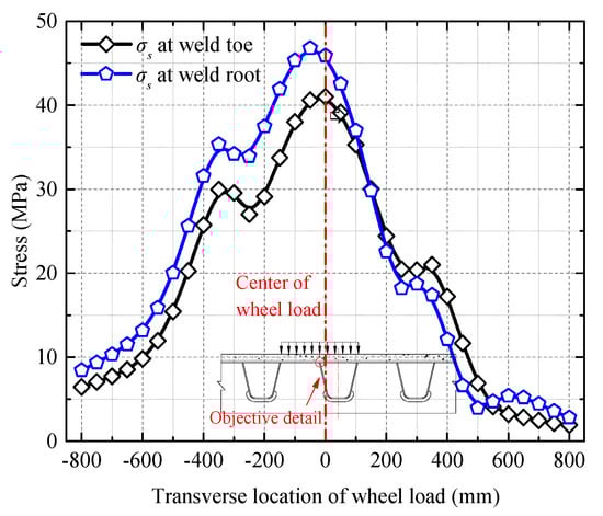 The scatter in the transverse location of the wheel load was considered in the fatigue damage evaluation, as shown in Figure 17. Correspondingly, the transverse influence lines of rib-deck weld (Figure 18) were also obtained for ease of calculating the stress amplitude. As shown in Figure 18, the stress at weld root is generally greater than that at weld toe. It indicates that the weld root is more easily subjected to fatigue cracking. Hence, in the following analysis, the fatigue damage at weld root is focused on. Additionally, it is noted that the equivalent stress amplitude could be considered to be equal to the equivalent stress at critical loading position [17]. Therefore, the equivalent stress amplitude could be obtained from Figure 18 without calculating the stress wave.