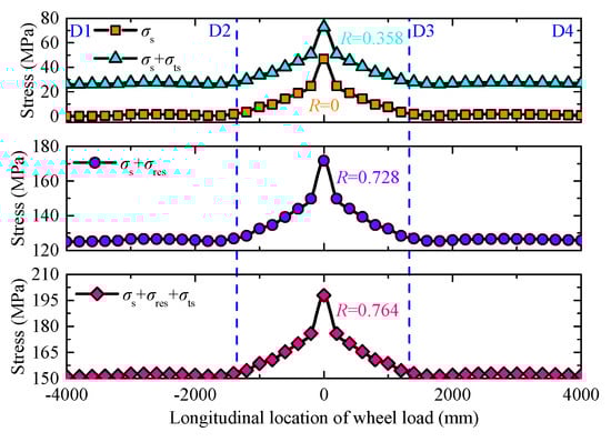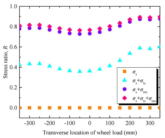 Similar with the welding residual stress (WRS), the residual temperature stress affects the mean stress induced by wheel loads, subsequently the stress ratio. In this study, the welding residual stress at weld root was set to 125 MPa according to published data [14]. Hence, the stress wave considering residual temperature stress and welding residual stress could be obtained based on the principle of superposition of stress, as shown in Figure 19. As can be seen in Figure 19, the stress ratio (R) increases from 0 to 0.358 after considering the residual temperature stress (labelled σts). Similarly, the R increases from 0 to 0.728 after considering the welding residual stress (labelled σres). While the coupling effect of σts and σres is considered, the R increases from 0 to 0.764. It demonstrates that the residual temperature stress (σts) affects the fatigue damage at rib-deck weld. However, it should be noted that the R given in Figure 19 only corresponds to one case of transverse location (i.e., 0 mm in Figure 17). Similar with the stress amplitude, the R also varies with the transverse location of wheel load, as plotted in Figure 20. The relative frequency of R is the same with that in Figure 17.
