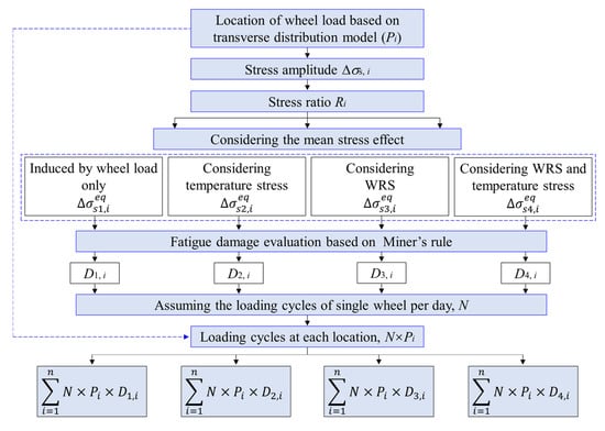 To investigate the effect of residual temperature stress, four cases were considered: fatigue damage induced by wheel load only (labelled D1); fatigue damage considering the effect of residual temperature stress (labelled D2); fatigue damage considering the welding residual stress (labelled D3); fatigue damage considering the coupling effect of residual temperature stress and welding residual stress (labelled D4). Figure 21 shows the flowchart of fatigue damage evaluation process. The calculated results are given in Table 3. It is seen that the fatigue damage has increased by 38.3% considering the residual temperature stress only. However, since the welding residual stress is nonnegligible in real-world OSDs, the fatigue damage considering the coupling effect of welding residual stress and residual temperature stress has more practical significance. The results show that the fatigue damage considering such coupling effect has increased by 10.2%. The increased fatigue damage induced by residual temperature stress equals to that induced by 255 loading cycles (i.e., 25.5% of the total per day) of wheel load. It reveals the considerable effect of residual temperature stress on fatigue performance of OSD. Based on the numerical results, a damage amplification factor of 1.1 is recommended to represent the effect of residual temperature stress.