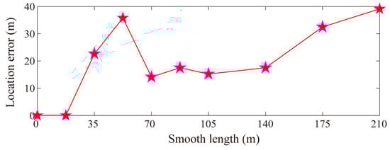 The location of blasting event 8 is taken as the example and its waveform inversion-based location results are demonstrated in Figure 1. The figure shows that with the increase of smoothing lengths, the smoothed velocity models gradually tend to be homogeneously distributed, which are characterized by the ray paths from the source to each sensor that gradually become straight lines. The 17.5 m smoothing obtained a 0 m location error, as when a relatively accurate velocity model is used for location, the waveform information related to source location could still be reasonably explored and inverted by the grid search and waveform inversion-based location method. When the model error increases (the smoothing length continues to increase), the source information contained in the data cannot be inverted or stacked correctly, and the location error introduced by velocity error appears. Location errors caused by reduction of velocity model accuracy do not follow a monotonous change law, due to location result is also being controlled by some other factors, such as specific triggered sensor geometric distribution and inhomogeneity of velocity structures near the source location. Furthermore, the overall location error increases with the decrease of velocity model accuracy (Figure 2), which confirms the necessity of an accurate 3D velocity model to waveform inversion-based location in regions with complex geological structural property. In addition, the errors of GSWI location results in this synthetic test with a small number of test events are all within 40 m. It is complicated to perform a completely quantitative analysis explaining the coupling effect between the location error and the current velocity model inaccuracy (such as by smoothing). The systematic location error analysis will be left to the future.