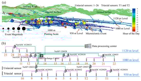 Microseismic monitoring model and system structure diagram of the microseismic (MS) system installed at the Yongshaba mine. (a) Microseismic monitoring model modified from Li et al. [52]. The red fonts correspond to the sensor id, green grid means the ground surface, dark orange line is the Jinyang road, blue lines are different mining levels, and light blue lines are the mining levels with sensor distributed. The spheres are locations of microseismic events; (b) System structure diagram of the MS system modified from Shang et al. [53]. The green line represents 4 core optical fiber, pink line represents 4 core signal cable, and the bold pink line represents 8 core signal cable.