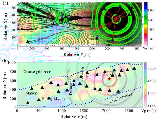 Ray propagation paths of the shooting method and schematic diagram of wavefield propagation by the spectral element method (SEM) modeling. (a) Ray propagation paths of the shooting method (modified from Wang et al. [6]). The background is a 2D sliced plane of the 3D velocity model, which is determined through the least square vertical distance from all sensors to the plane. The black triangles represent the sensor locations, and the red star denotes the source location. The black thin curves are ray propagation paths from different angles of the source, the red lines are ray propagation paths from the source to each sensor, and the green curves are the wavefronts; (b) Schematic diagram of wavefield propagation by SEM modeling. The time interval between adjacent wavefronts is 0.004 s, and the wavefield amplitude is globally normalized to show the attenuation, focusing, and defocusing characteristics of wavefield propagation in complex media. The dotted line shows the boundary of the fine grid region.