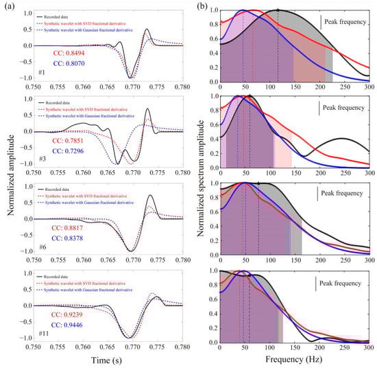 Fitting performance of windowed observed waveforms and synthetic waveforms based on different source-time function estimation approaches and their corresponding amplitude spectra. (a) Waveform fitting illustration of synthetic waveforms generated by the data-driven singular value decomposition averaged fractional derivative (DD-SVD-FD) source-time wavelet (red curve) and frictional-order Gaussian source-time function (blue curve). The black curve represents the windowed observed waveforms. The normalized cross-correlation coefficient between DD-SVD-FD source-time function and windowed observed waveform is shown in red text, while the normalized cross-correlation coefficient between frictional-order Gaussian source-time function and windowed observed waveform is shown in blue text. The number corresponds to the renumbering of sensors, which is ranked from early to late according to the initial P phase arrival time. (b) Normalized amplitude spectra correspond to the colored waveforms shown in (a). The vertical dotted line is the peak frequency and the shaded region shows the half-bandwidth frequency range.
