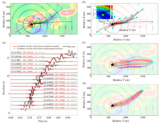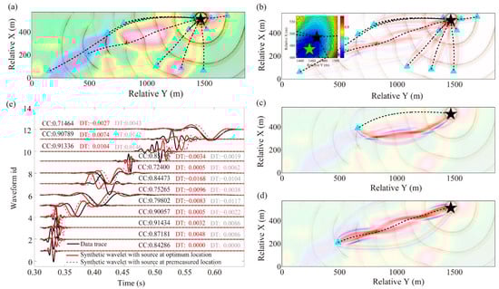 Taking the blasting events 1 and 3 as the cases to illustrate 3D MS-GSWI location method, their location results are shown in Figure 6 and Figure 7, respectively. Figure 6b–d and Figure 7b–d also demonstrate that velocity parameter sensitivity kernels of cross-correlation travel time anomaly have broader and more reasonable illumination range compared with the simple infinite-frequency assumption-based geometric ray tracing methods (Figure 6b and Figure 7b). The sensitivity kernels of cross-correlation travel time anomaly are closely related to the frequency content of the wavefield, and here only the distribution of sensitivity kernels calculated by the Gaussian source-time function with main frequency of 120 Hz is displayed. If the frequency bands tend to infinite high frequency, the sensitivity kernels of travel time anomaly will shrink to a very narrow tube just like the geometric ray. The sensitivity kernels of travel time based on numerical waveform modeling can better reveal multi-path effects around strong low-velocity anomalies (Figure 6c,d and Figure 7c) and evident wavefield interference influence (Figure 7d). In strongly heterogeneous media, the changes of sensitivity kernels of travel time corresponding to the changes of source location will also present very sophisticated characteristics.