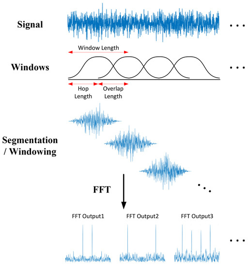 where is the input signal, is the window function, is the length of the window, is the time frame index, and is the frequency index. Here, denotes the hop length, and the overlap length between adjacent frames is . In addition, the overlap ratio between consecutive frames is . At a specific time , the signal is multiplied by the window function . Therefore, Equation (1) can be defined as the FFT operation of . The STFT processor measures the frequency over time by moving the window function along the signal according to the hop length and performing the FFT operation on samples inside the window. The flow of the algorithm is shown in Figure 1.