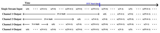 Because a single data stream is input to the STFT processor, we need a windowing module (WM) that receives a single data stream and creates four data streams that overlap by 75% between each channel. For a window length of , the input and output data flows of the WM are as shown in Figure 5. The output data of channel 1 is delayed by cycles of the input data stream, and the output data of channel 2 is delayed by cycles of the input data stream. The output data of channel 3 is delayed by cycles of the input data stream. Finally, the output data stream of channel 4 is output without delaying the input data stream. The FFT operation starts after the first data of channel 1 is delayed by cycles. That is, the FFT operation starts when the data on channel 1 and channel 2, channel 2 and channel 3, channel 3 and channel 4 overlap by 75% each and are input into the FFT processor.