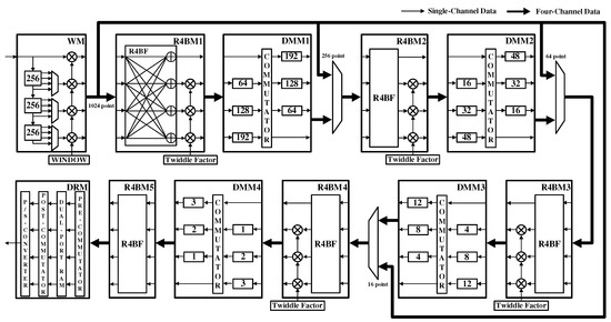 The 75% overlapped data streams are output through the four channels of the windowing module as input to the FFT processor, which performs the FFT operation to measure the frequency content changes over time. As previously stated, current FFT hardware architectures that can be considered for designing an STFT processor are generally classified as single butterfly architectures, pipeline architectures, and parallel architectures. The parallel architecture has the most significant advantage in terms of throughput rate but has high hardware complexity. The single butterfly architecture has the lowest hardware complexity, but offers a low throughput rate. In contrast, the pipeline architecture offers a good tradeoff between throughput and complexity and is consequently used in many fields [20,21,22].