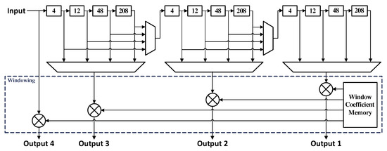 The STFT processor should be capable of varying the overlap ratio according to the window type to minimize the data loss due to the tapering window. Therefore, the STFT processor needs a windowing module that overlaps the input data stream at a certain overlap ratio and multiplies the signal by the window function. Figure 2 shows how windows are overlapped at ratios of 0%, 25%, 50%, and 75% in the windowing module. Figure 2b,c shows window overlaps at ratios of 25% and 50%, respectively, and that the windowing module requires at least two output channels to overlap a single data stream by 25% and 50%. Figure 2d shows a window overlap of 75%. In this case, the windowing module requires at least four output channels to overlap a single data stream by 75% overlap ratio. In addition, when the windowing module supports a 75% overlap ratio, channels 1 and 3 of the windowing module have a 50% overlap ratio, channels 1 and 4 have a 25% overlap ratio, and channel 1 has a 0% overlap ratio. In other words, a windowing module that supports a 75% overlap ratio also includes 0%, 25%, and 50% overlap ratios. Therefore, to support a variable overlap ratio, the windowing module should be able to receive a single data stream and create four data streams overlapped by 75% between each channel.