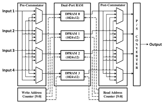 The DRM makes the four-channel data after the FFT operation match the predefined overlap ratio, as shown in Figure 6, and then outputs it. In this paper, the DRM is implemented using the architecture proposed in [26], and Figure 9 shows the hardware architecture of the proposed DRM. The pre-commutator reconstructs four-channel input data for the dual-port RAM (DPRAM). Because we need to support 16/64/256/1024-point variable lengths, we use multiplexers to enforce the necessary data alignment pattern for the 16/64/256/1024-point FFTs, respectively. The output of DPRAM is reconstructed and used as the input of the post-commutator, which uses multiplexers to reconstruct the data so that it matches the MDC data structure. The parallel-to-serial (P/S) converter selects data from the four-channel output of the post-commutator in the order that matches the predefined overlap ratio and outputs it as a single stream.