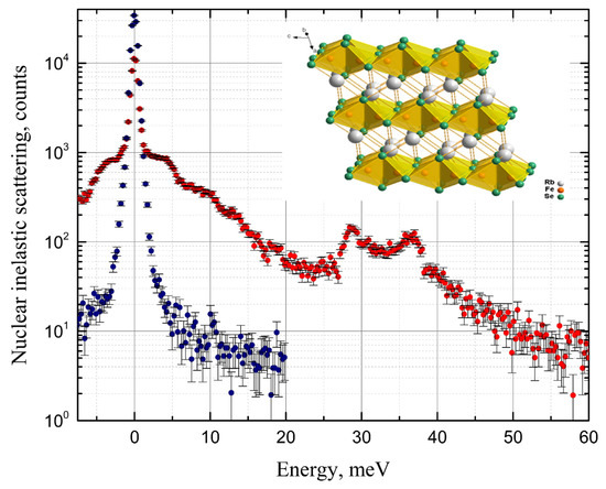 The nuclear inelastic scattering [11,12] experiment was carried out at the Dynamics Beamline P01 of PETRA III synchrotron (DESY, Hamburg, Germany) [13]. The measurements utilizing the nuclear gamma-resonance of 57Fe at 14.413 keV were performed with an inline high-resolution monochromator providing an energy bandwidth of 0.9 meV full width at half maximum (FWHM). The sample with natural enrichment by 57Fe was measured at 295 K. The Fe NIS spectrum of RbFeSe2 is shown in Figure 1 (red dots) along with the instrumental function measured simultaneously with the spectrum (blue dots in Figure 1).