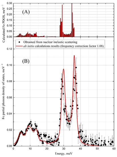 The red colored histogram in Figure 2A shows PDOS which is output of ab initio calculations [3] with the calibrated frequency scale (see below). The solid red line in Figure 2B shows the calibrated (cf. Section 3) partial PDOS for the iron atoms obtained from the previously calculated ab initio one, Figure 2A. The calculated PDOS is a discrete set of contributions from phonon modes, while the experimental one is a quasi-continuous sequence determined by the settings of the beamline setup, but to the greatest extent by the monochromator energy (frequency) resolution of 0.9 meV. To compare the experiment with the ab initio calculated iron partial PDOS the latter was convoluted with a Gaussian profile with an FWHM of 0.9 meV matching the resolution window of the monochromator. The result of the convolution is just the solid red line presented in Figure 2B.