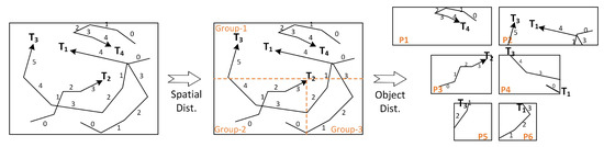 The is essential as it represents the RDD partition id (). The first term in Equation (6), , acts as an offset for spatial groups where represents the object-based partitioning for each spatial group. In case of having a segment that does not fit in an SK-tree’s leaf, the segment is split into two segments and then reinserted again. At the end, RMOI uses GroupBy transformation on the to distribute on new RDD partitions such that . Even though Algorithm 1 shows the general outlines of the partitioning stage, there is a special case when . As mentioned before, this special case guarantees a full trajectory-preservation, which implies that the space-splitting is not needed. It does not require the construction of the SK-tree or the execution of the tagging procedure. Moreover, it combines the Map transformation and GroupBy transformation, Lines 9 and 12, whereas a GroupBy transformation only returns the result of as a key. There is no need for the offset, as there is only one spatial group.