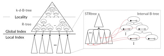 The local index, denoted by LocalRMOI, consists of STRtree [35] and interval B-tree [36]. STRtree is a packed R-tree that uses the Sort-Tile-Recursive (STR) algorithm. Unlike the GlobalRMOI, the LocalRMOI favors the temporal dimension, where the interval B-tree is kept separately from STRtree. Each interval node is associated with a subtree of the local STRtree allowing us to traverse the local index based on the interval B-tree, as seen in Figure 2.