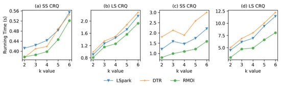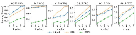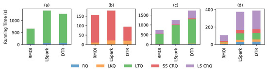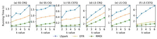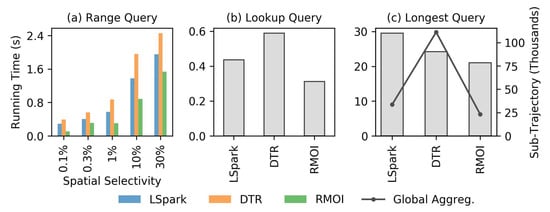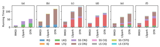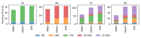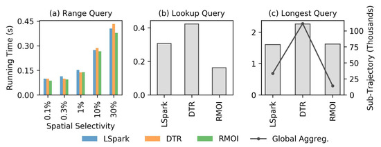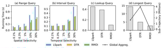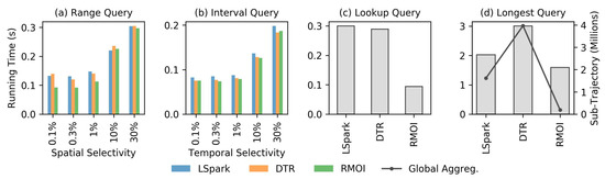 Figure 5 and Figure 6 show the average running time on low resource availability (4 GB of memory and 2 threads) on the SF dataset. Both RMOI and DTR have better performance than LSpark on RQ and IQ with large selectivity, as shown in Figure 5a,b. With the lookup query, RMOI shows a speedup by a factor of 4.2× on the average, as seen in Figure 5c. RMOI outperforms DTR and LSpark on the longest query by factors of 1.9× and 3.6×, respectively. With continuous queries, RMOI shows a speedup range from 1.5× to 7× the speed of competitors, Figure 6.