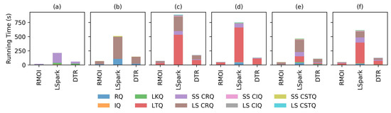 We also ran the second testbed on the UK + IE dataset. With high resource availability, RMOI gains a speedup by a factor 1.6x on the average, as seen in Figure 12; while on average it outruns LSpark by a factor 2.1× and DTR by a factor of 2.1× on low resource availability, Figure 13. However, it did not do as well on the second query set. RMOI predicts to be 2 on the second query set, while it predicts to be 6 and 7 on the other sets. The overall performance of RMOI is outstanding, especially on a very sparse dataset. Similar to the previous results, LTQ and LS CRQ are the most expensive query types, especially with low resource availability. The first query set has 35% LTQ, and the third set has 22% LTQ and 23% LS CRQ. These high percentages reflect on the cumulative running time, as seen in Figure 13a,c. One of the main reasons for running time surging is the GC’s full-scan (Garbage Collector), which is triggered on heavy queries with low system resources. Moreover, it might cause a series of reactions that affect other performance factors, such as network, resource manager, cluster utilization, etc.