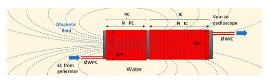 According to the experiments performed in previous works [26], the induced voltage will depend on the characteristics of the coil, such as N, ØW, and the diameter of the induced coil (ØIC). Moreover, the induced voltage, also known as the Vout, depends on the B and μr. Generally, this principle is used with coils that have a ferromagnetic core, and is the principle of the power transformers.