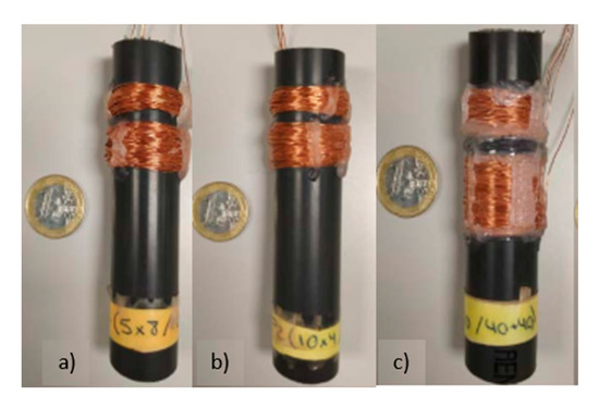 We selected a relation of spires based on the results of previous works [33], so that all three prototypes were composed of 40 spires in the PC and 80 spires in the IC. The copper wire used had a diameter of 0.4 mm. The three prototypes had the same number of spires but were distributed in a different number of layers, to test which ones performed better in detecting OF. In the model presented in Section 2, the effect of a single layer, or multilayer coils, are not described, it is essential to figure out the effect of the number of layers in the sensitivity of the coil. The used prototypes are displayed in Figure 2. Prototype 1 (P1) had been coiled in 8 layers, prototype 2 (P2) in 4 layers, and prototype 3 (P3) was coiled in 2 layers (see Table 1). Moreover, all of the prototypes were coiled in the same direction (clockwise direction) to maintain the coil characteristics as similar as possible.